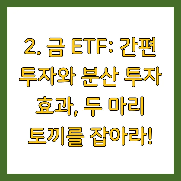 금 ETF(Exchange Traded Fund), 금 가격을 추종하는 펀드로 주식처럼 거래소에서 사고팔 수 있습니다. 소액으로도 금 투자를 시작할 수 있고, 분산 투자 효과까지 누릴 수 있는 매력적인 상품이죠.